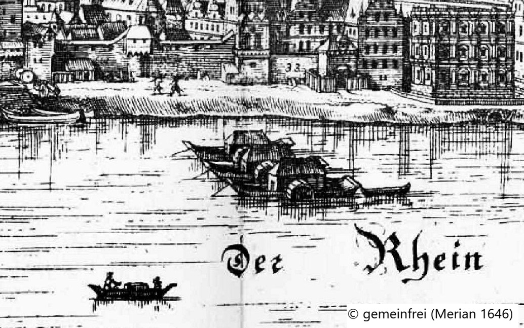Leider habe ich bisher nur das Kurzregest, d.h. die gekürzte Abschrift gelesen und noch nicht die Originalurkunde, wo möglicherweise weitere Informationen zu finden sein könnten. Darin werden Ginsheimer  Rheinmühlen im Zusammenhang einer „Eheberedung“ im Jahr 1473 zwischen Diether von Hoemberg (auch Besitzer eines nicht mehr identifizierbaren Gutshofes in Ginsheim) und seiner Frau Lyse von Scharfenstein (Besitzerin des heutigen Dauborn-Hauses, Hauptstraße 44) genannt. Letztere bringt als „Heimsteuer“ (vermutlich Aussteuer) von ihren Brüdern die Rechte am Mühlenwasser und an zwei Mühlen auf dem Rhein sowie weitere Acker- und Hofgüter mit.